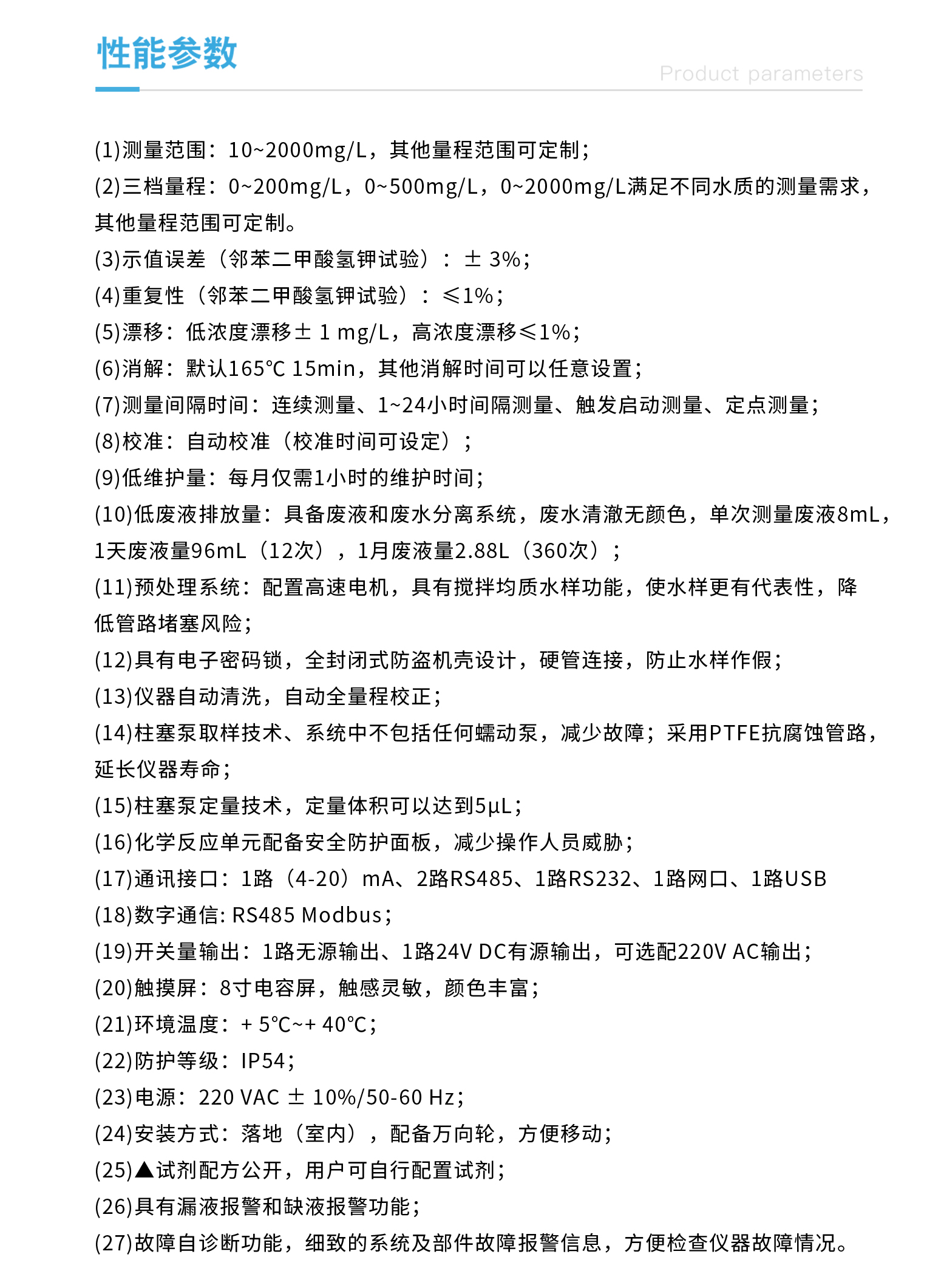 测量原理:采用重铬酸钾法高温消解,用光度法测量样品吸光度,通过吸光度与水样COD值的线性关系进行分析测定。符合标准HJ 828-2017。 三档量程:0~200mg/L,0~500mg/L,0~2000mg/L满足不同水质的测量需求,其他量程范围可定制。